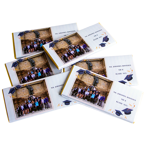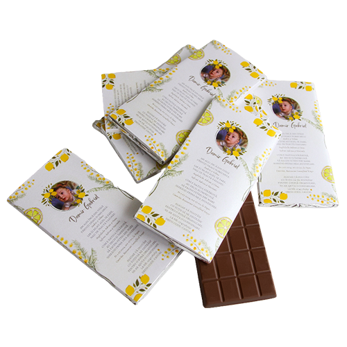 Invitatie cu ciocolata cu lapte/amaruie si diverse umpluturi, personalizata si ambalata in staniol argintiu.